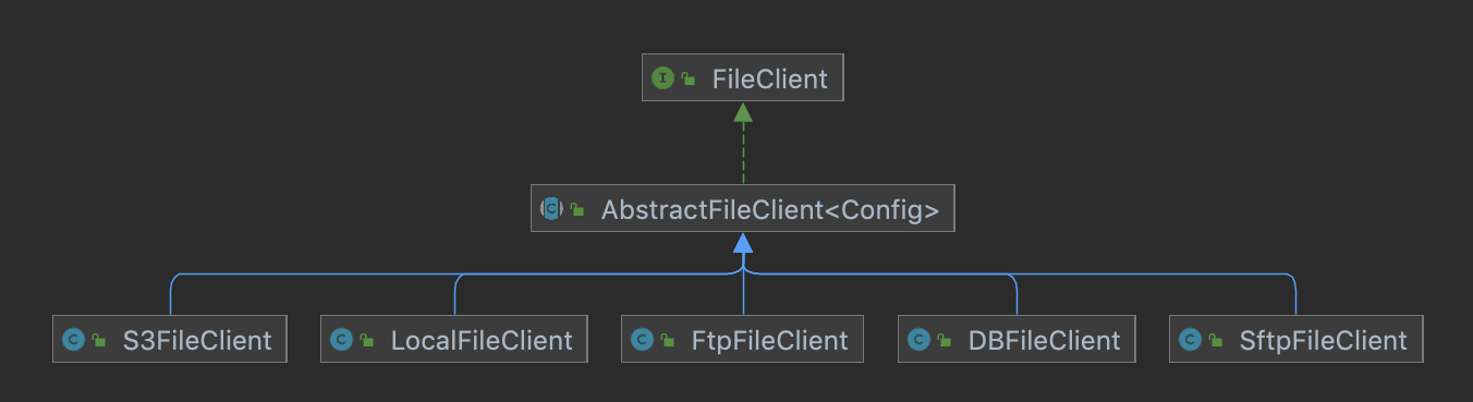 FileClient 有 5 个实现类,使用不同存储器进行文件的上传与下载。UML 类图如所示: